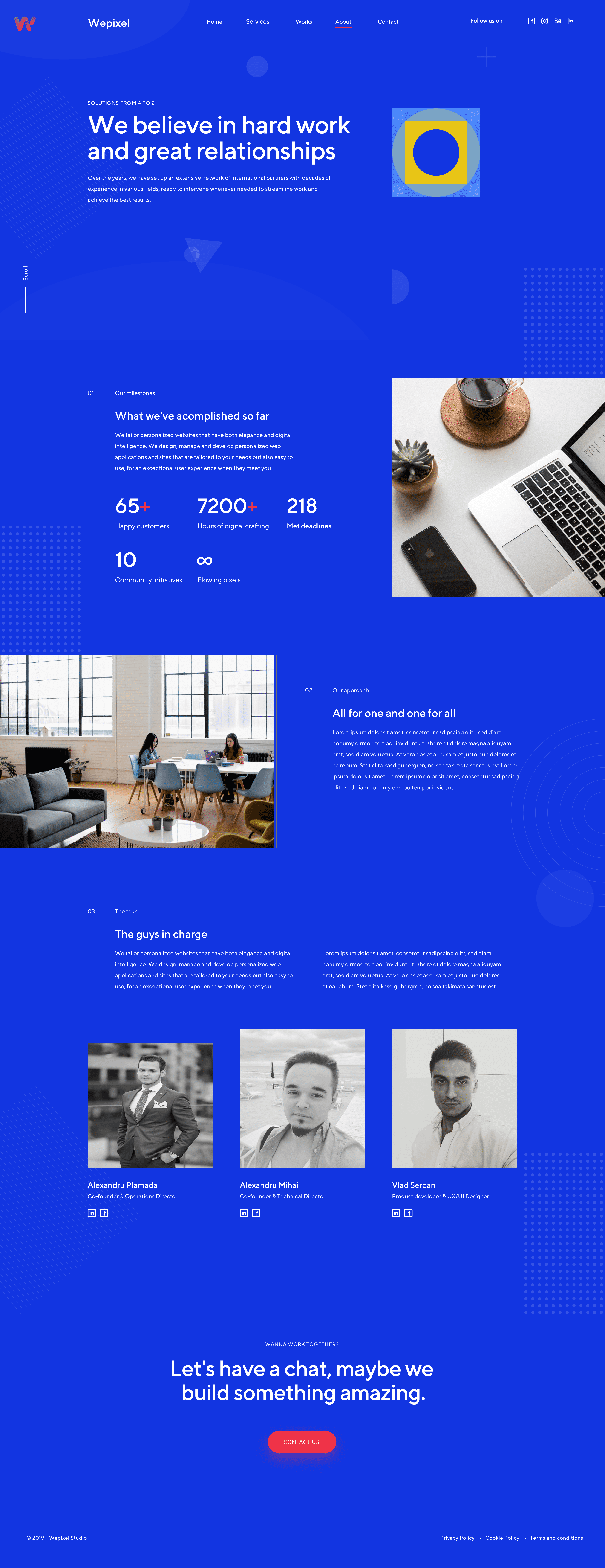 Wepixel is a young and ambitious creative agency from Iasi, Romania, that provides services ranging from web development to digital marketing. As Visual & Web designer, I was tasked to design a mobile-first website, accompanying it with the necessary visuals, such as iconography, or illustrations, but also thinking and providing models of interaction between pages or elements.